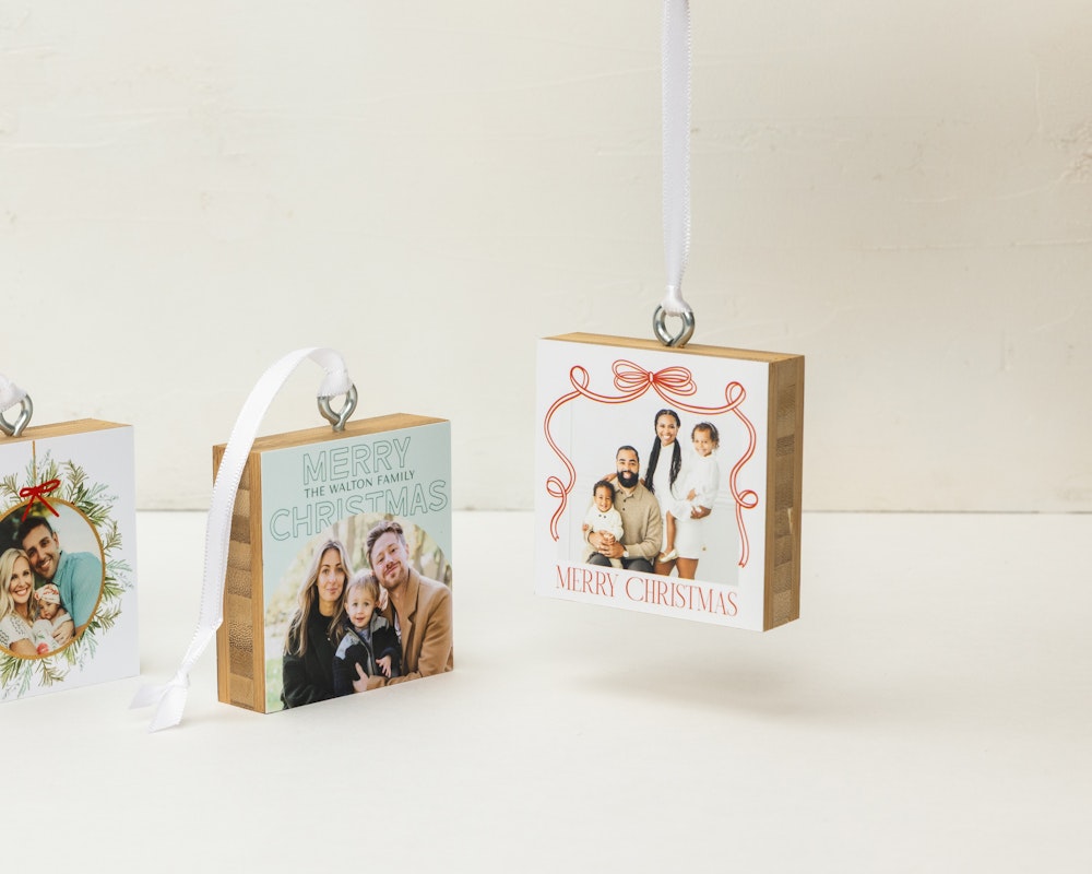 Complement your client's holiday card with a matching, personalized Bamboo ornament. Each festive design features multi-photo openings, text layouts, and color options.