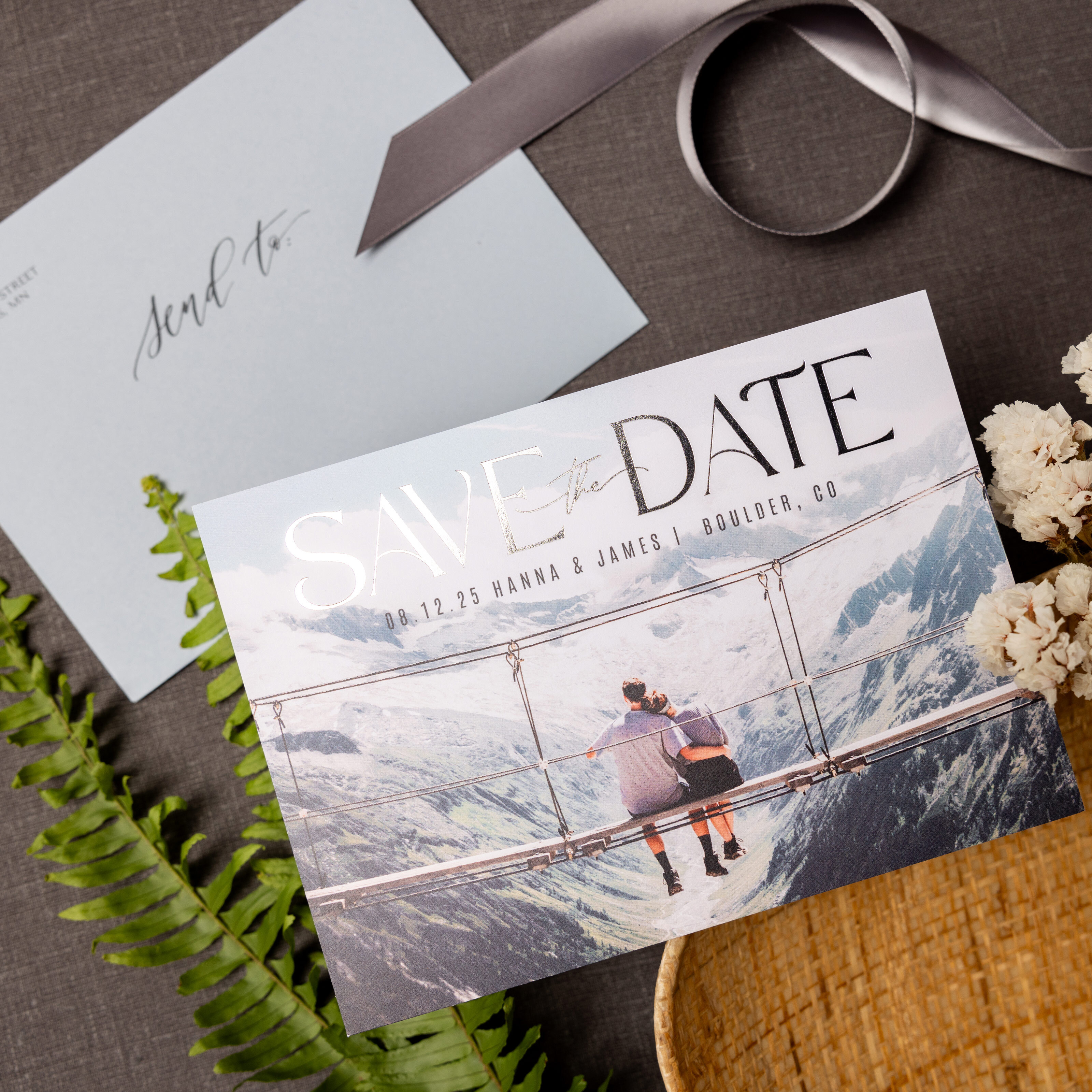 5×7″ Flat Card with silver foil on our "Timeless Love Save The Date" wedding card design