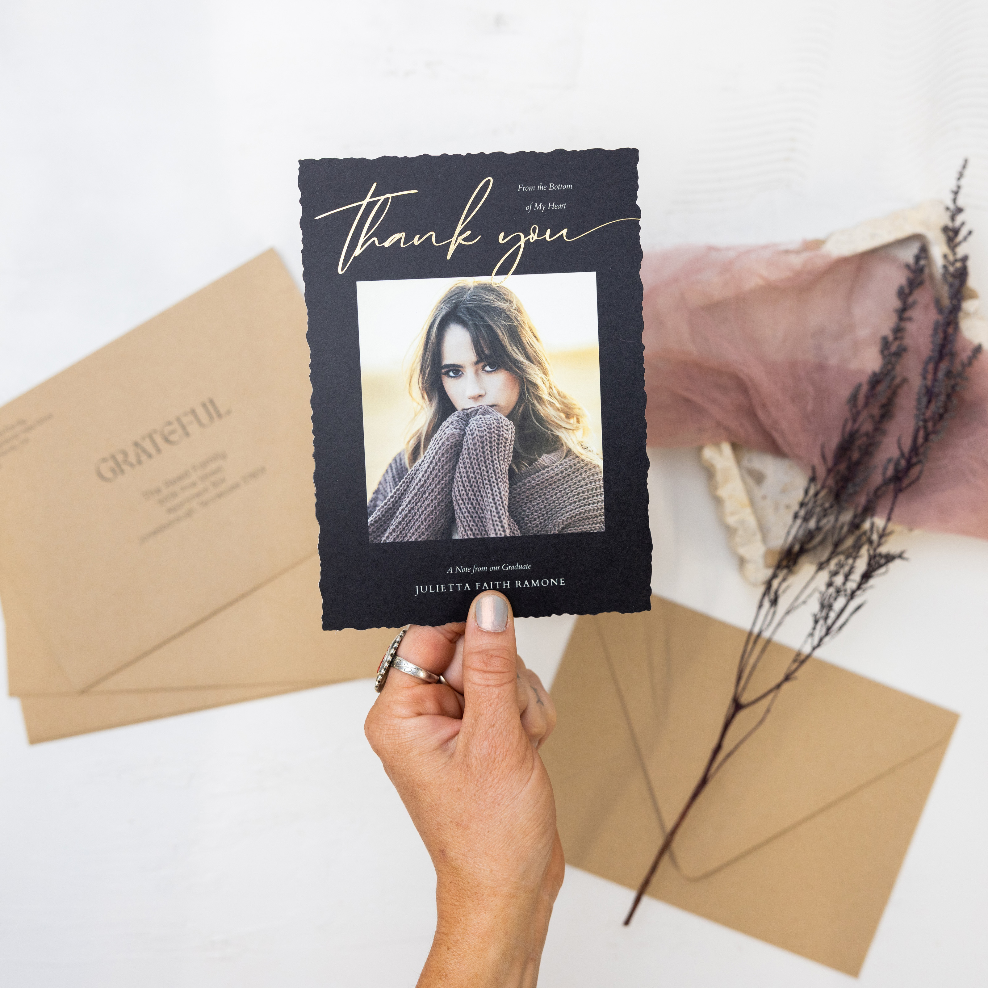 5×7″ Flat Card with gold foil on our "Unlimited Thanks" graduation thank you design
