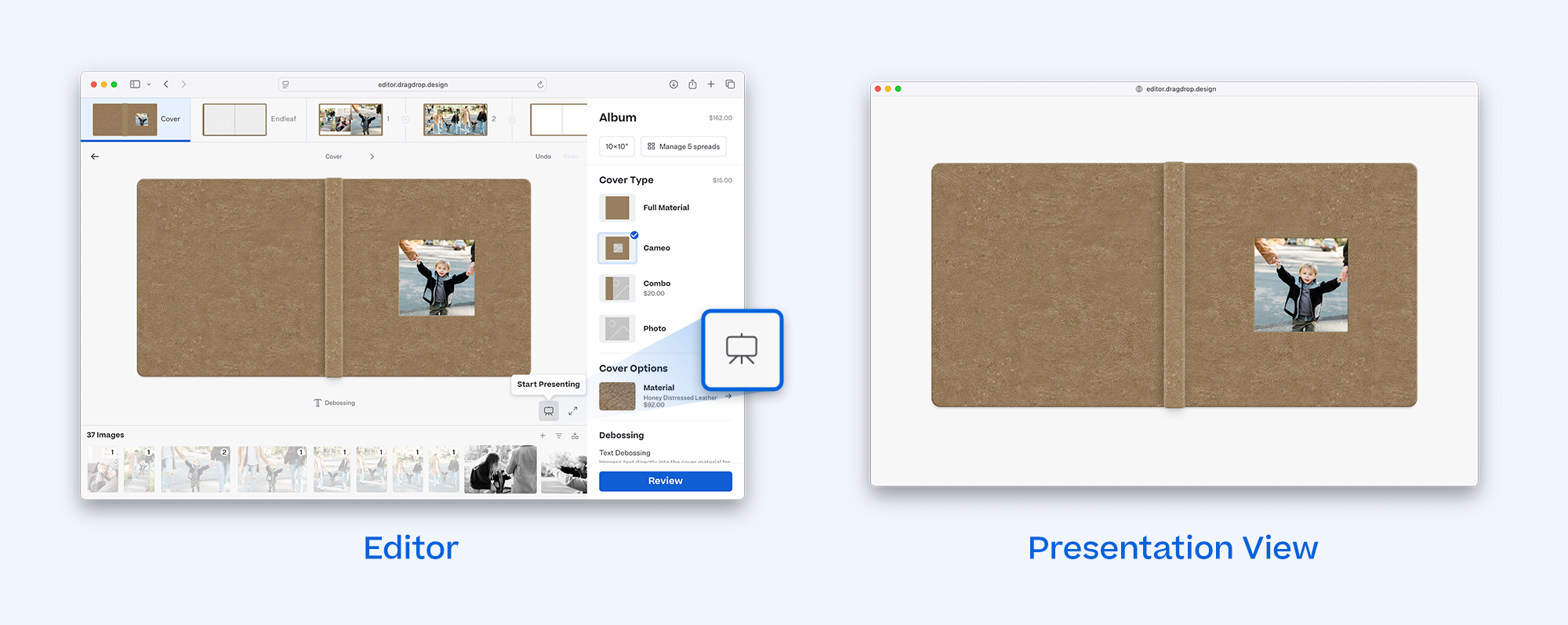 The Presentation View your clients see will update on "confirm" or "commit" actions, such as when you swap an image, select a color option, or navigate between spreads. While editing text, the view updates when you apply the change or click outside the text box, allowing you to type without worrying about mistakes displaying remotely.