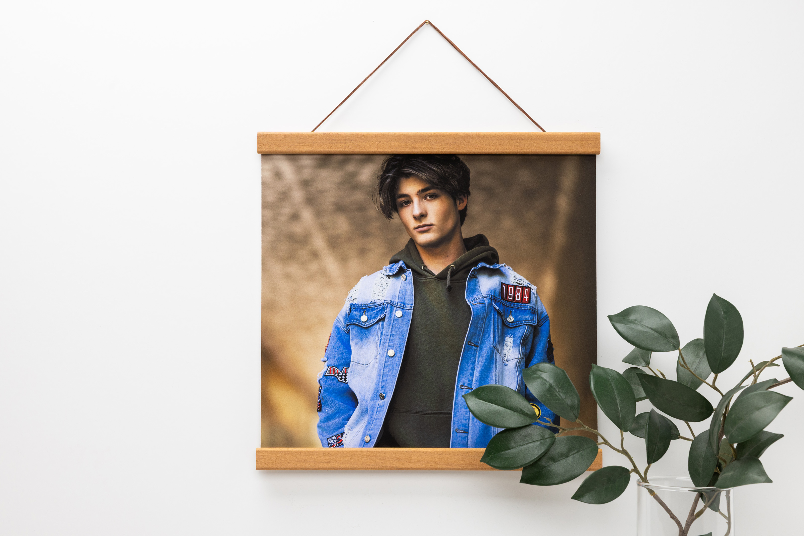 professional high school seniors portraits displayed as metal posters against a white background A close-up of a metal print corner featuring a mountain and lake image on a white surface.