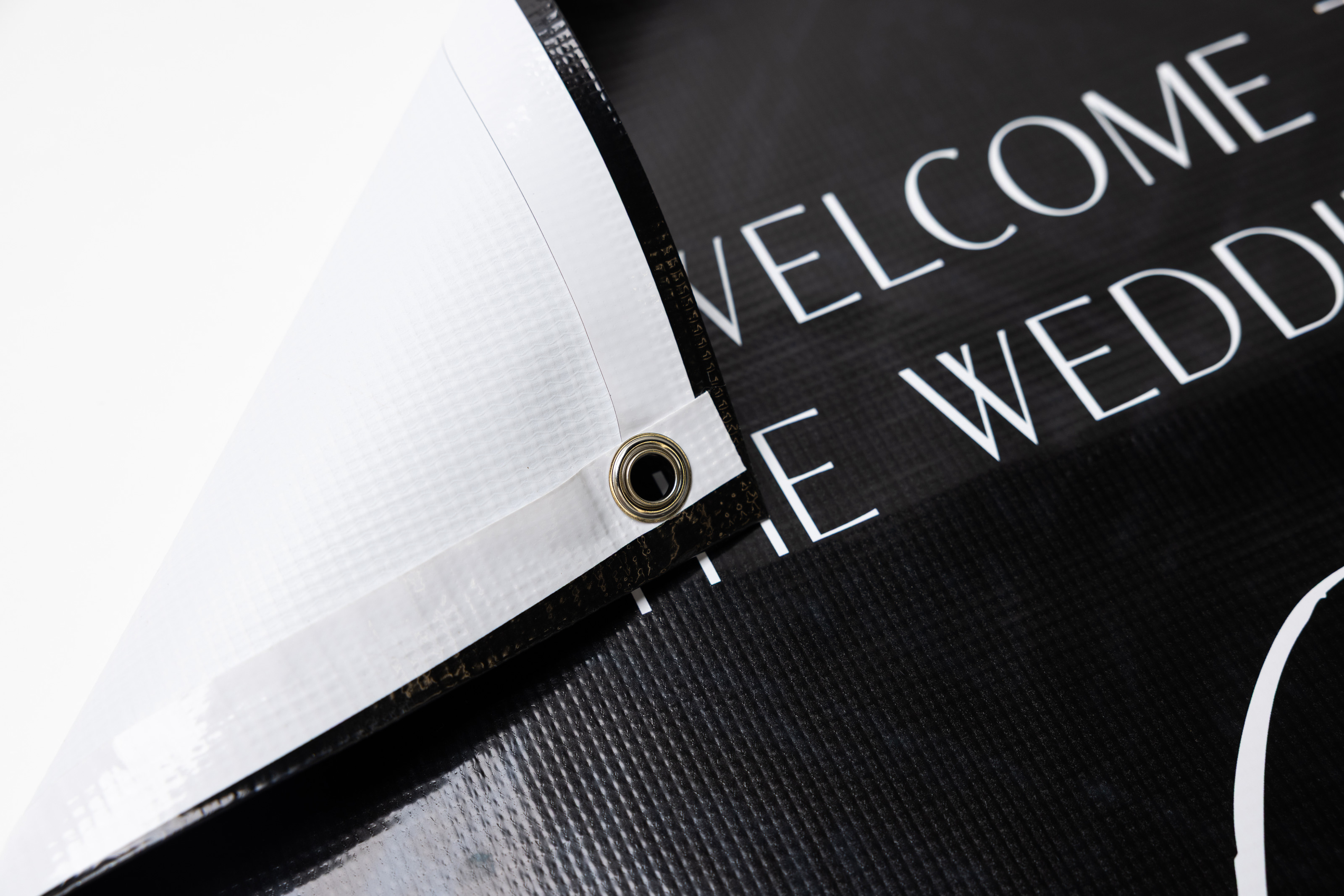 Finished with silver grommets and comes with bungees for quick, secure display |