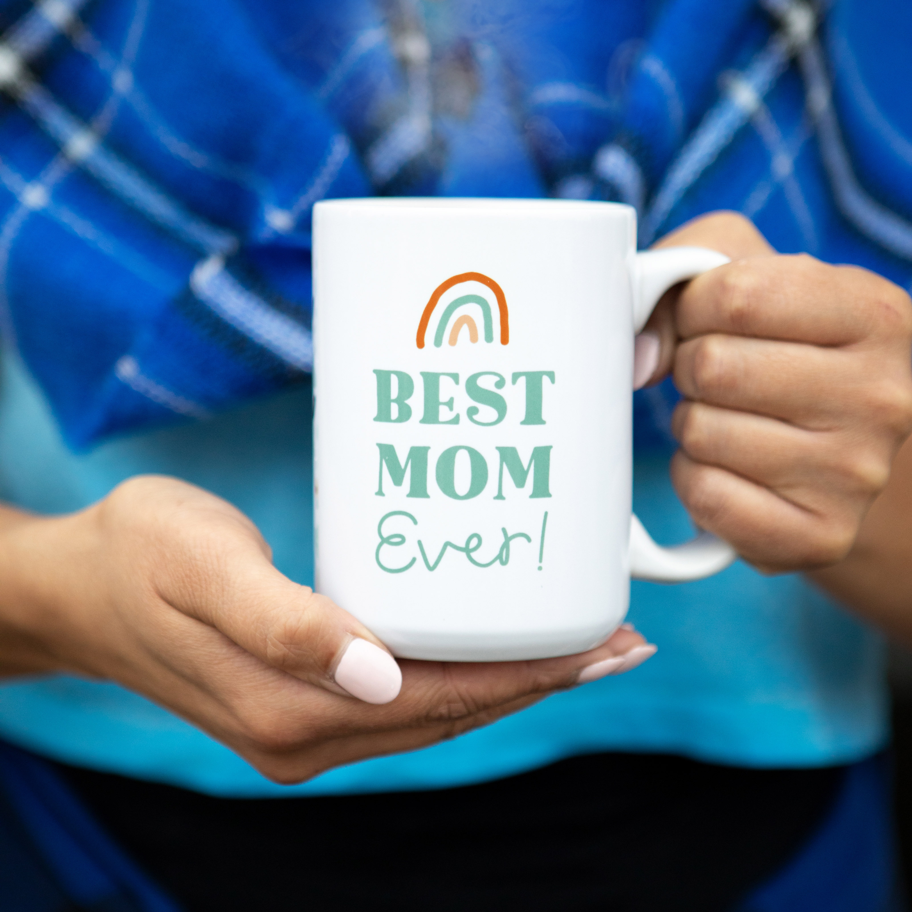 Close-up of hands with ring holding a custom printed mug with an illustration design