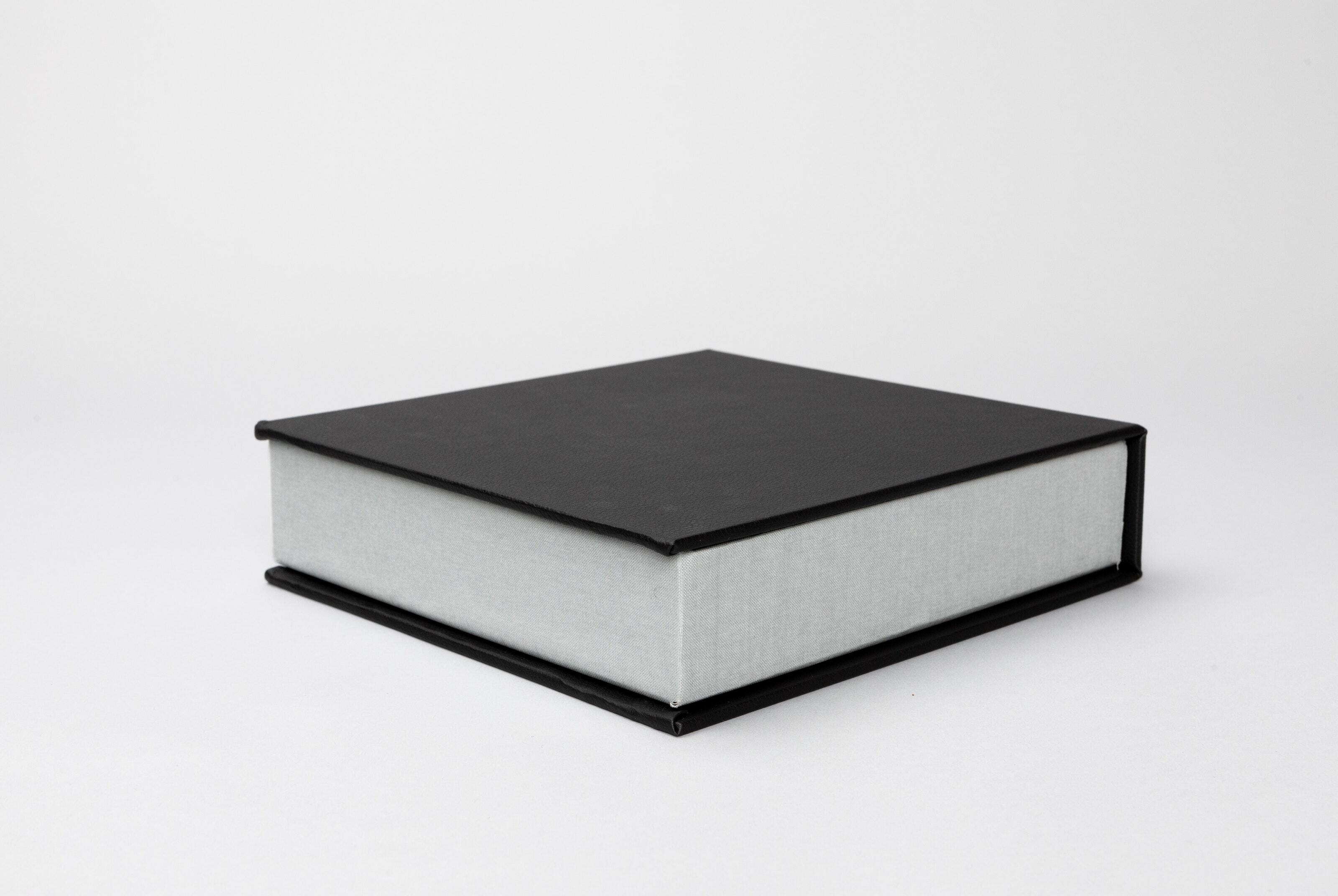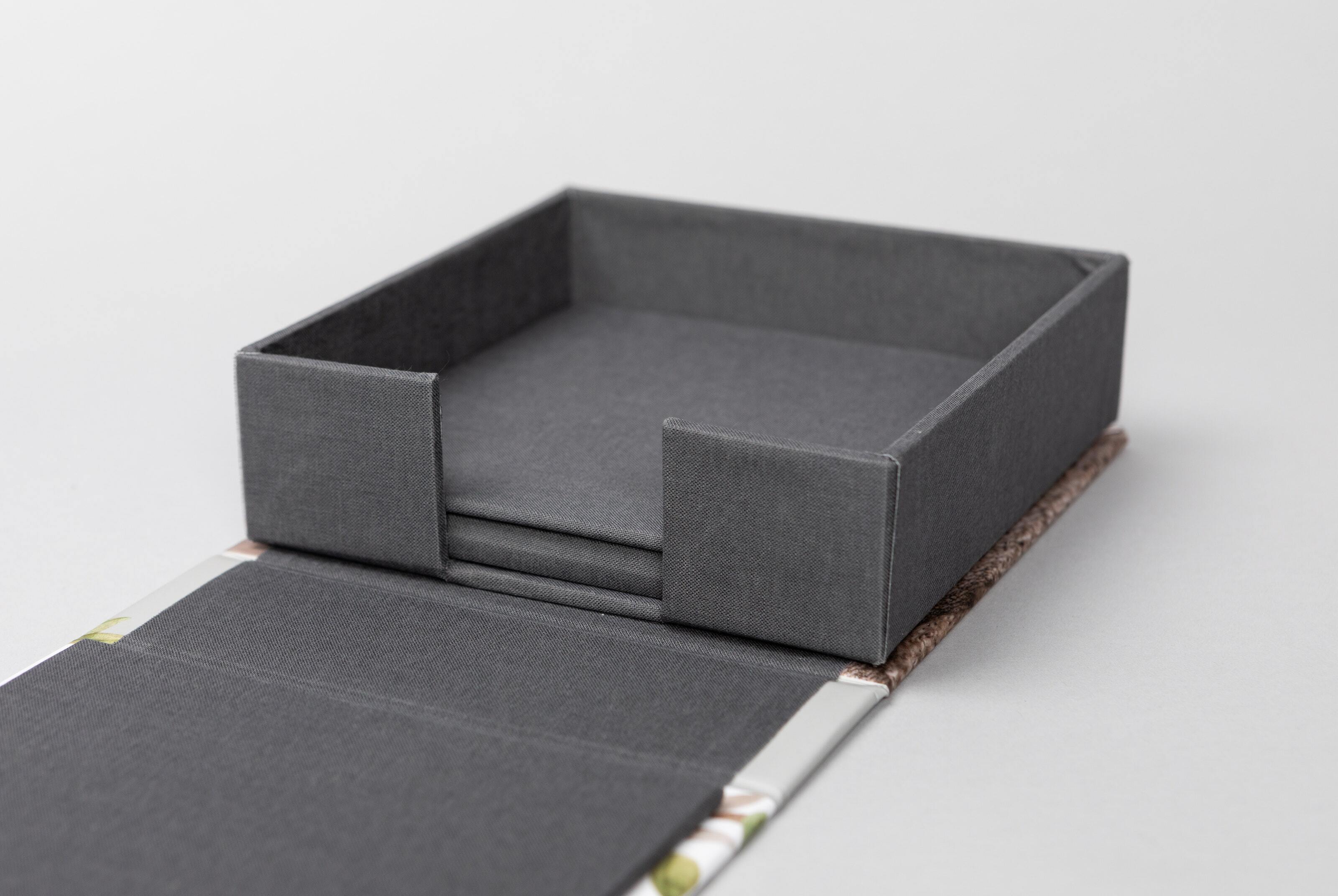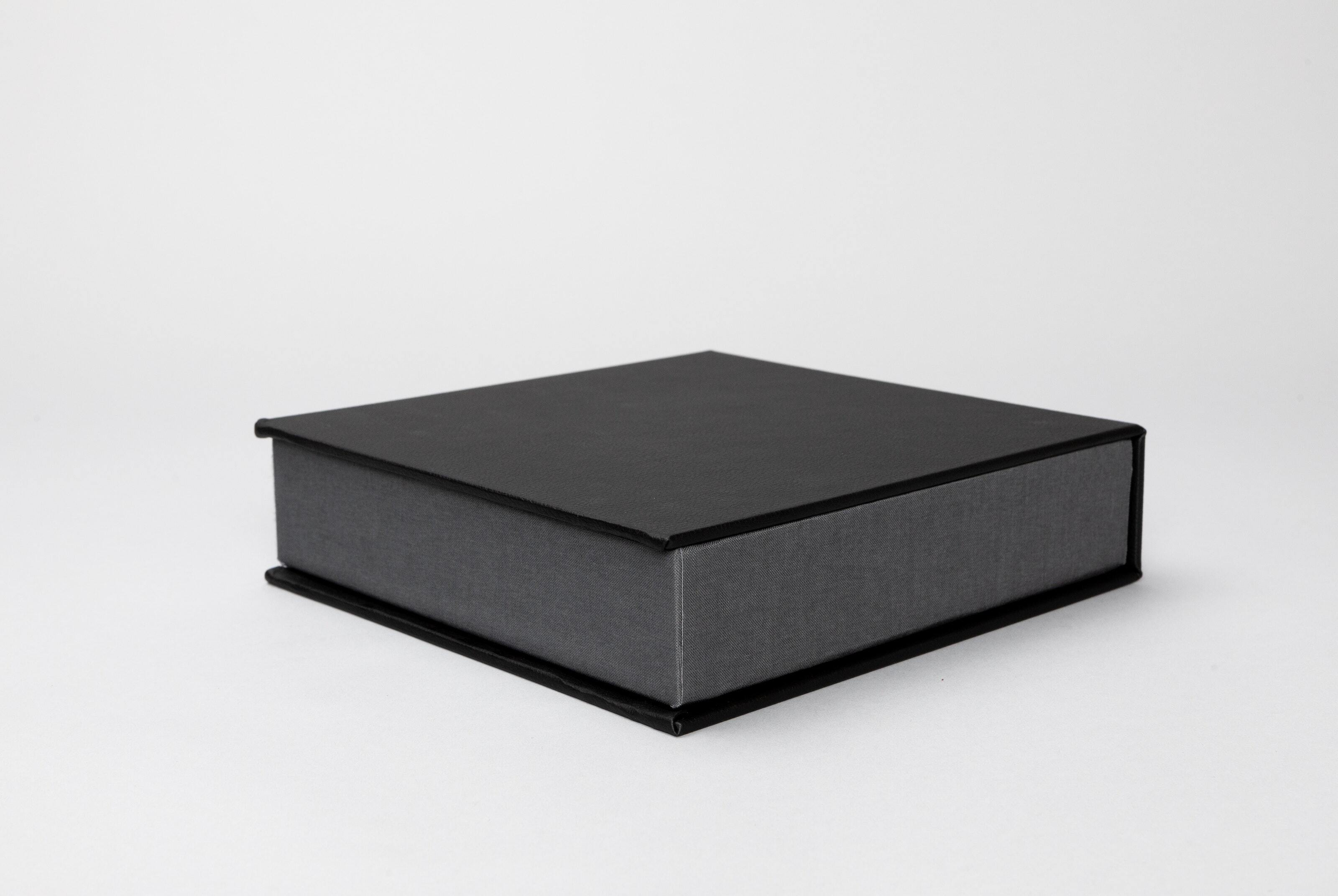 Pictured: 8×8" square box wrapped in gray interior fabric. Square Print Boxes and Album Boxes have an interior fabric option, while all other Print Boxes have black interior fabric.