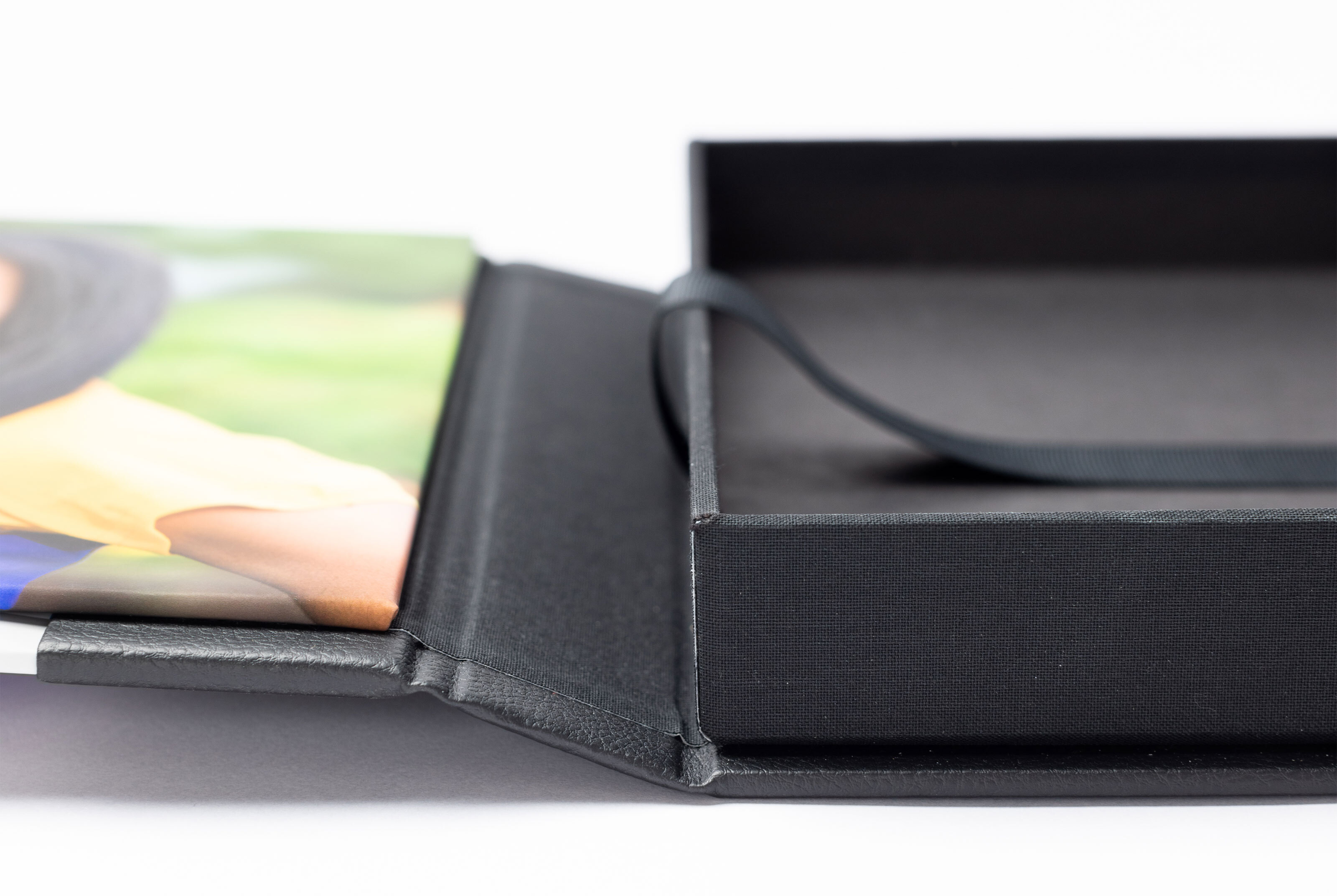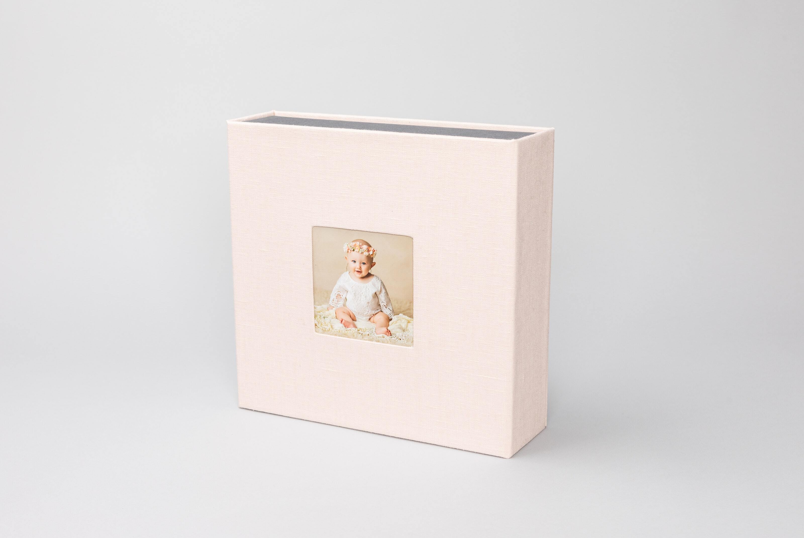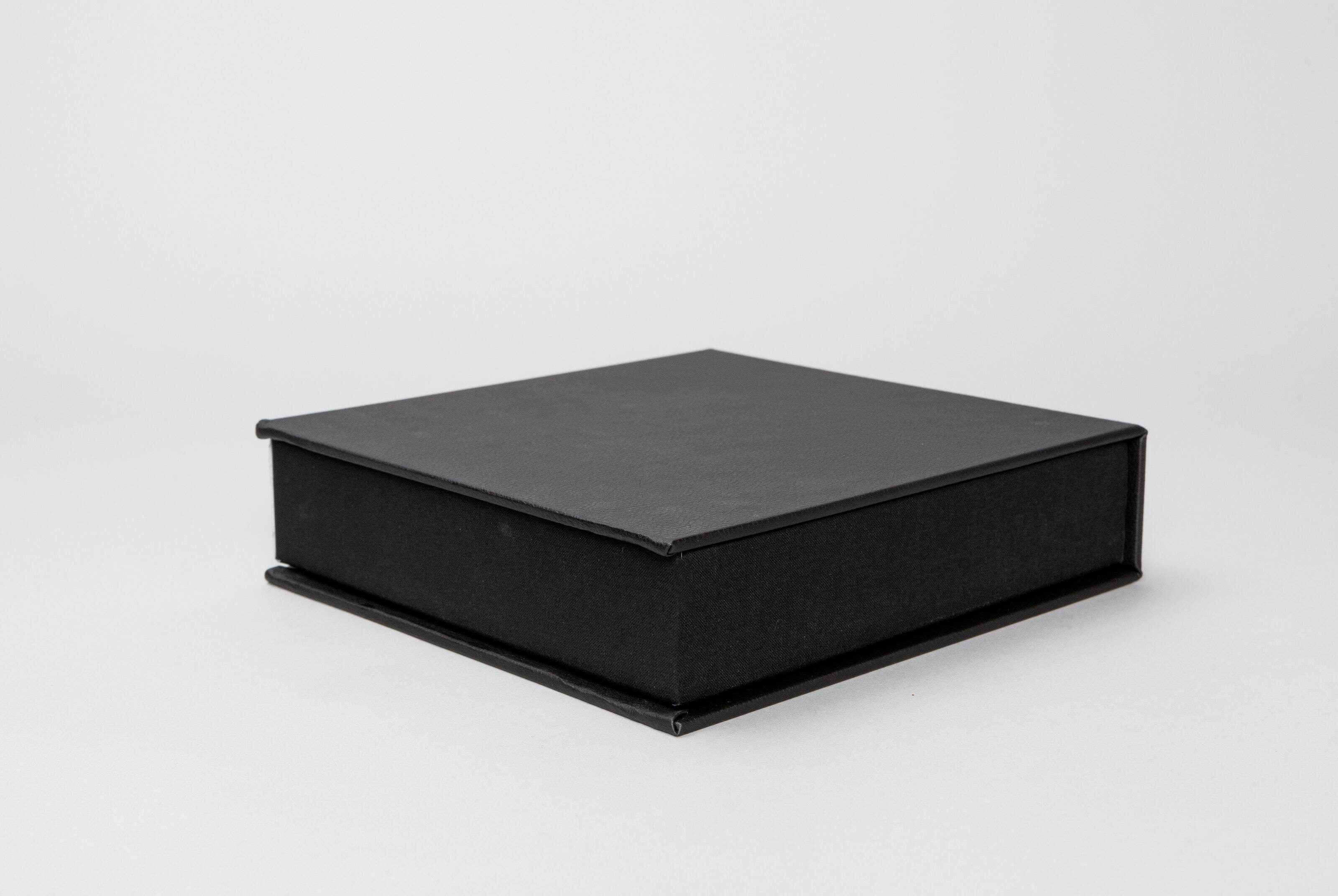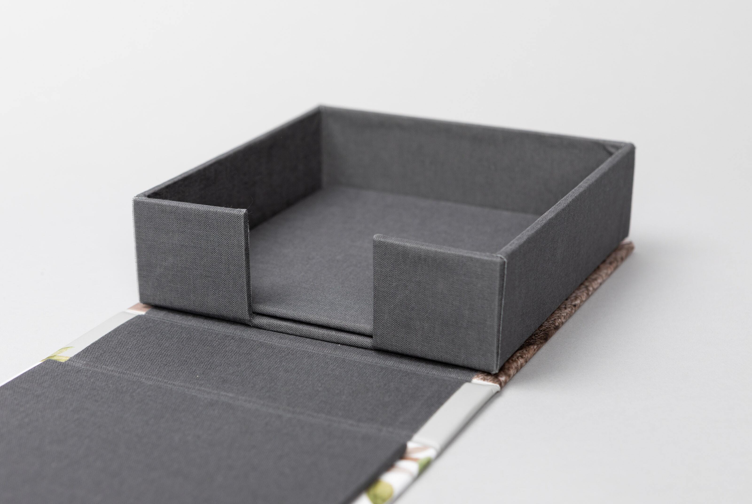 Pictured: 8×8" square box wrapped in gray interior fabric. Square Print Boxes and Album Boxes have an interior fabric option, while all other Print Boxes have black interior fabric.